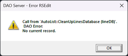March 8, 2026, 2:05 p.m. While running AutoLIST, the process hangs when cleaning up lines databaseDAO Server - Error RSEditCall from 'AutoList :: CleanUpLinesDatabase (lineDB)'.DAO Error:No current record.Then followed by th…